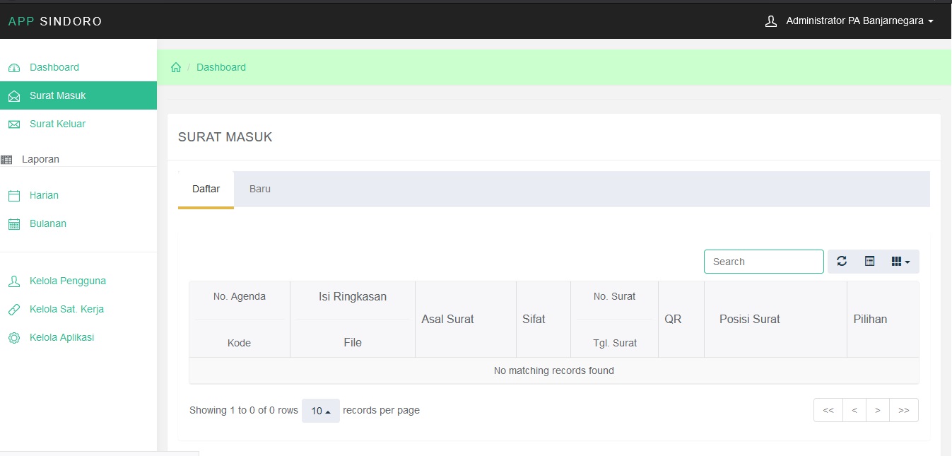 Menu Surat Masuk berisi data surat dari luar yang ditujukan kepada SATKER pengguna.