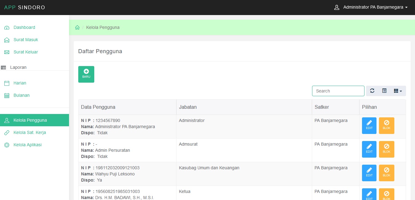 Untuk pengguna ini mempunyai akses penuh ke seluruh menu, namun dibatasi oleh Satuan Kerja, khususnya dalam pengelolaan pengguna, menghapus surat, dan edit surat.