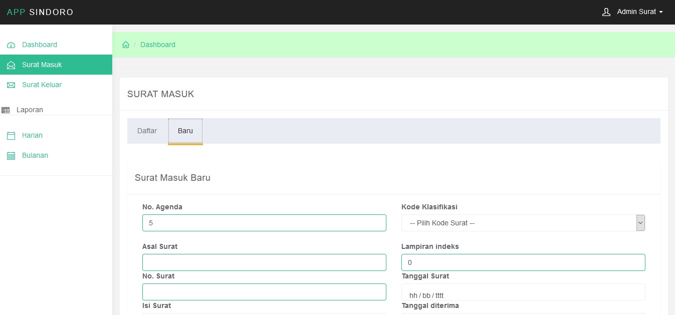 Menu Harian berisi rangkuman data harian surat masuk maupun surat keluar.